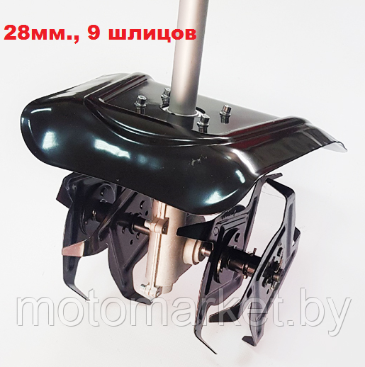 Насадка для мотокосы может быть установлена на триммер с диаметром штанги 28 мм. и валом - 9 шлицов. Материал щитка - металл.